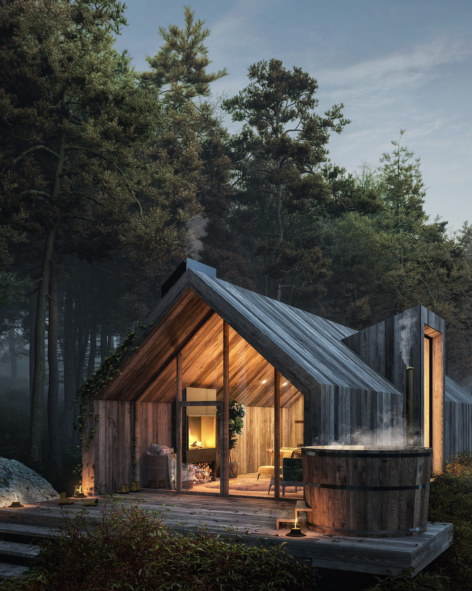木屋的形狀和顏色設計主要是為了模糊外部和內部空間之間界限。木屋的設計旨在提供一個...